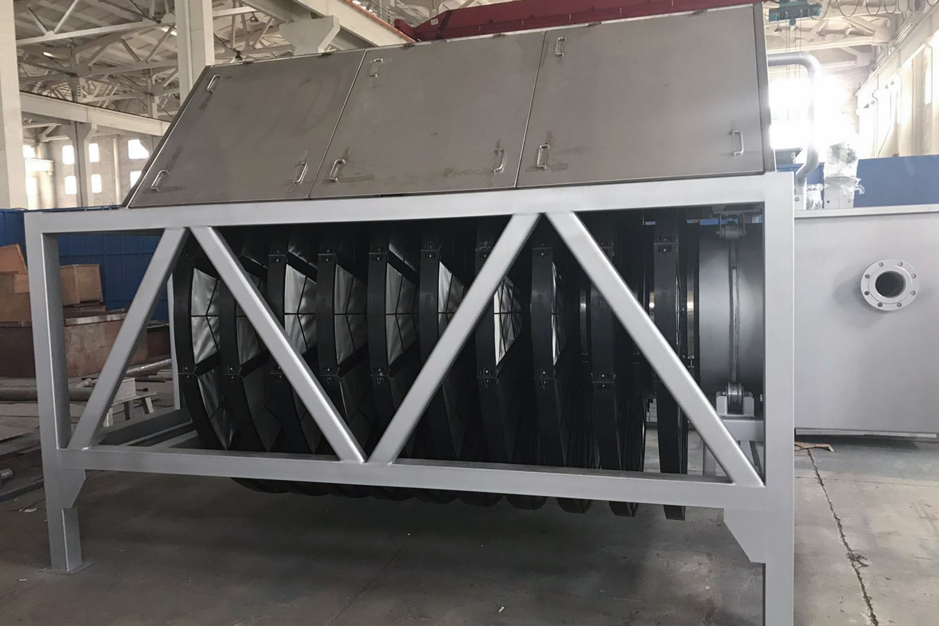 濾布濾池:該系統(tǒng)包括混泥土池體、進水堰箱、出水可調堰板、支撐軸座、中空設備主體(等邊六角形或者圓形)、纖維濾盤、支撐滑輪、出水口密封組件、排污系統(tǒng)、驅動裝置、自動化控制系統(tǒng)。設備主體端部與支撐軸座法蘭連接,出水管置于支撐滑輪上,并安裝出水密封組件;纖維濾盤垂直安裝在設備主體上;濾盤內部設有骨架,用于支撐包裹在外面的濾布,骨架中空,并與設備主體連接固定后形成一個外部密封,內部中空的整體;排污系統(tǒng)包括池底排污和濾盤反洗,每個濾盤的兩側設有反抽吸裝置。運行時,污水經過進水堰箱,均勻進入濾池,由外向內通過濾盤,由濾盤上的濾布截留污物后的凈水進入中空設備主體,然后排出池外。